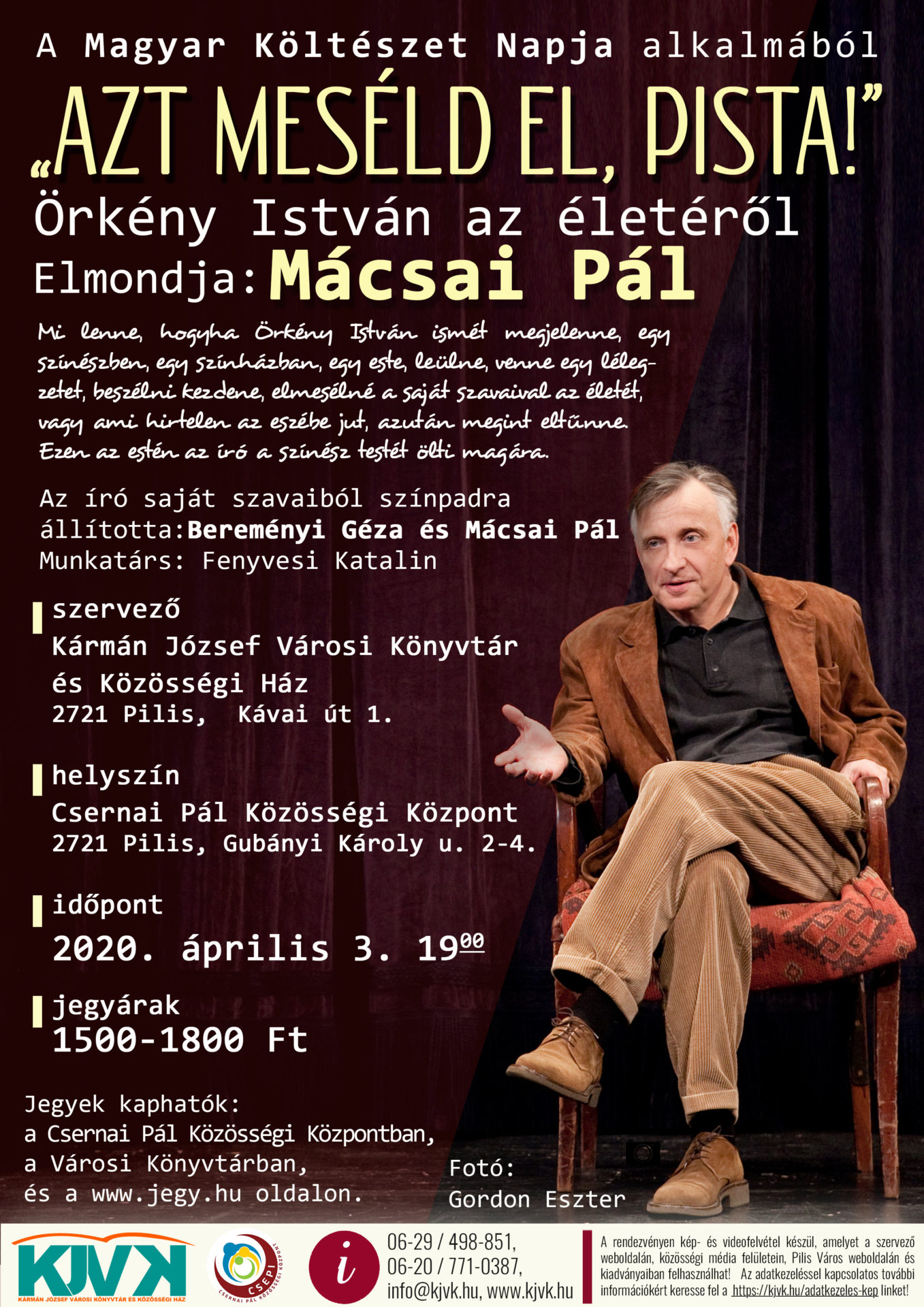 A Magyar Költészet Napja alkalmából április 3-án, pénteken, 19 órai kezdettel a Kármán József Városi Könyvtár és Közösségi Ház szervezésében érkezik Pilisre az előadás.